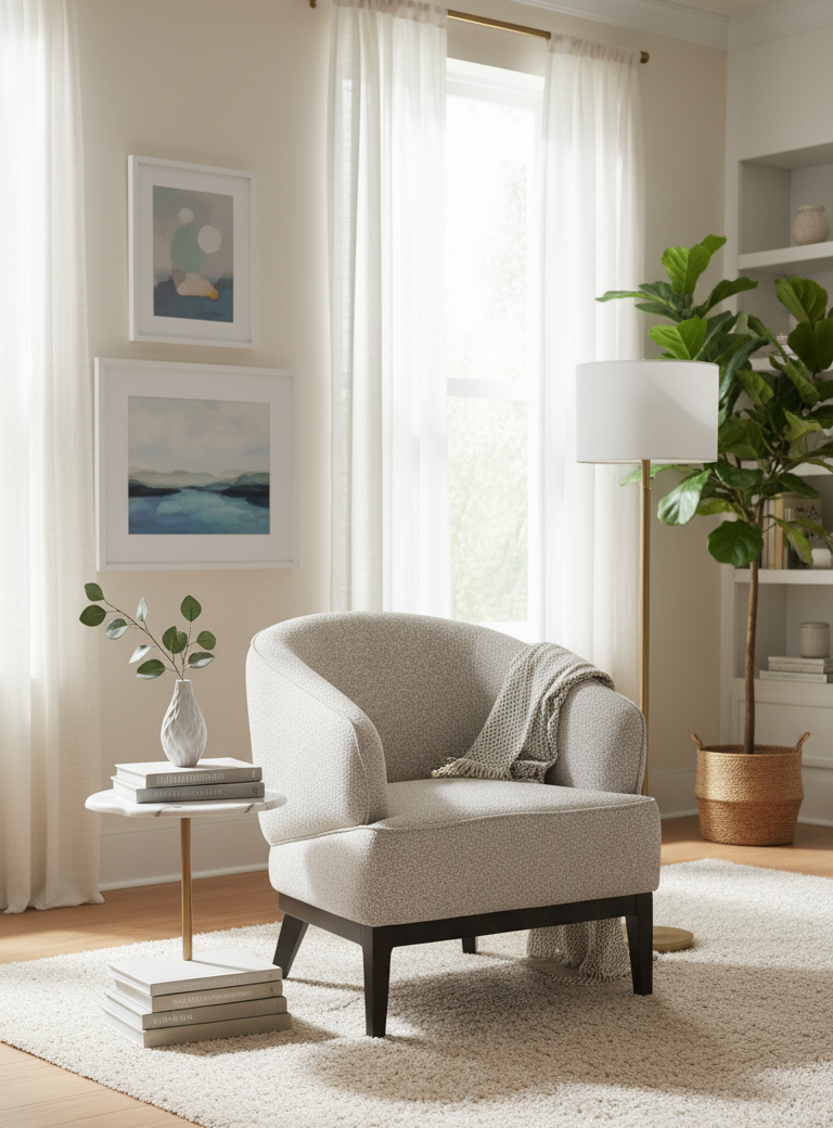 Este sillón combina diseño moderno y comodidad excepcional, ideal para cualquier espacio de tu hogar u oficina. Su estructura elegante y minimalista, con respaldo y brazos ligeramente curvados, brinda soporte y confort al mismo tiempo. Tapizado en tela de alta calidad color neutro, se integra fácilmente con distintos estilos de decoración, mientras que su base y patas en madera sólida aportan estabilidad y durabilidad. Medidas: Largo: 74 cm Ancho: 80 cm Alto: 80 cm